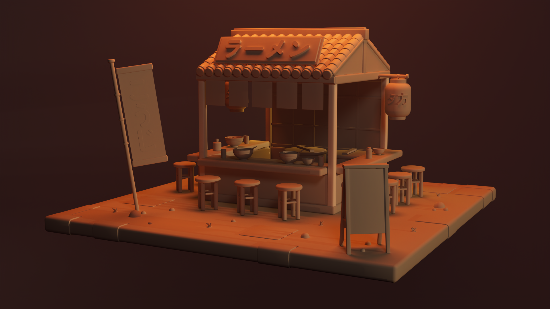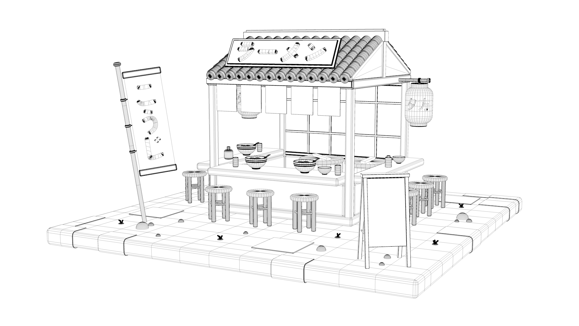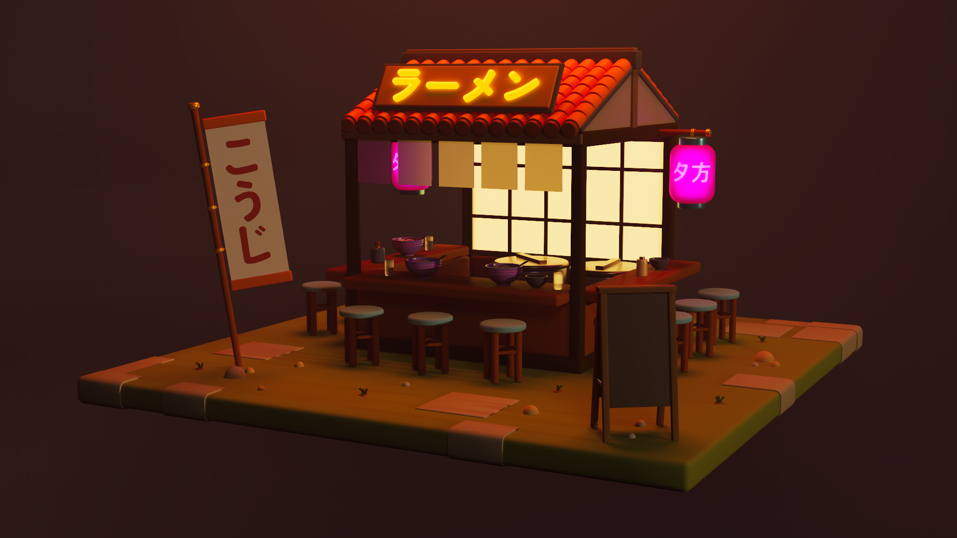 Inspirado en los icónicos yatai japoneses, este diseño ha sido cuidadosamente elaborado con un estilo low-poly, jugando con luces cálidas y detalles minimalistas para transmitir una atmósfera acogedora.